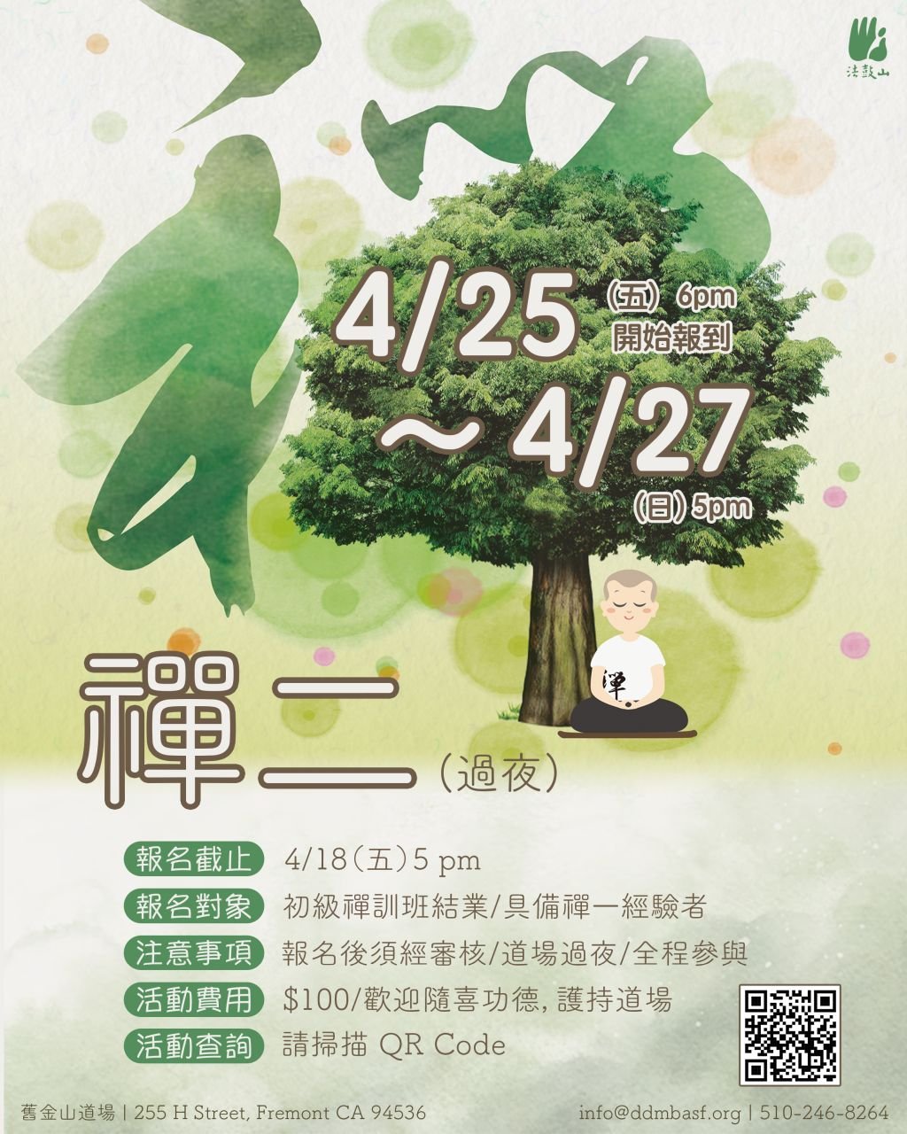 練習禪修的方法和觀念,引導簡易的禪坐、體驗呼吸和放鬆,是「初級禪訓班」及「禪一」的接續體驗課程。透過三天兩夜的短期共修,禪眾對禪訓班之觀念與方法能夠更加熟練,並了解、體驗與適應禪七規矩和作息,是進入初階禪七的先修班。